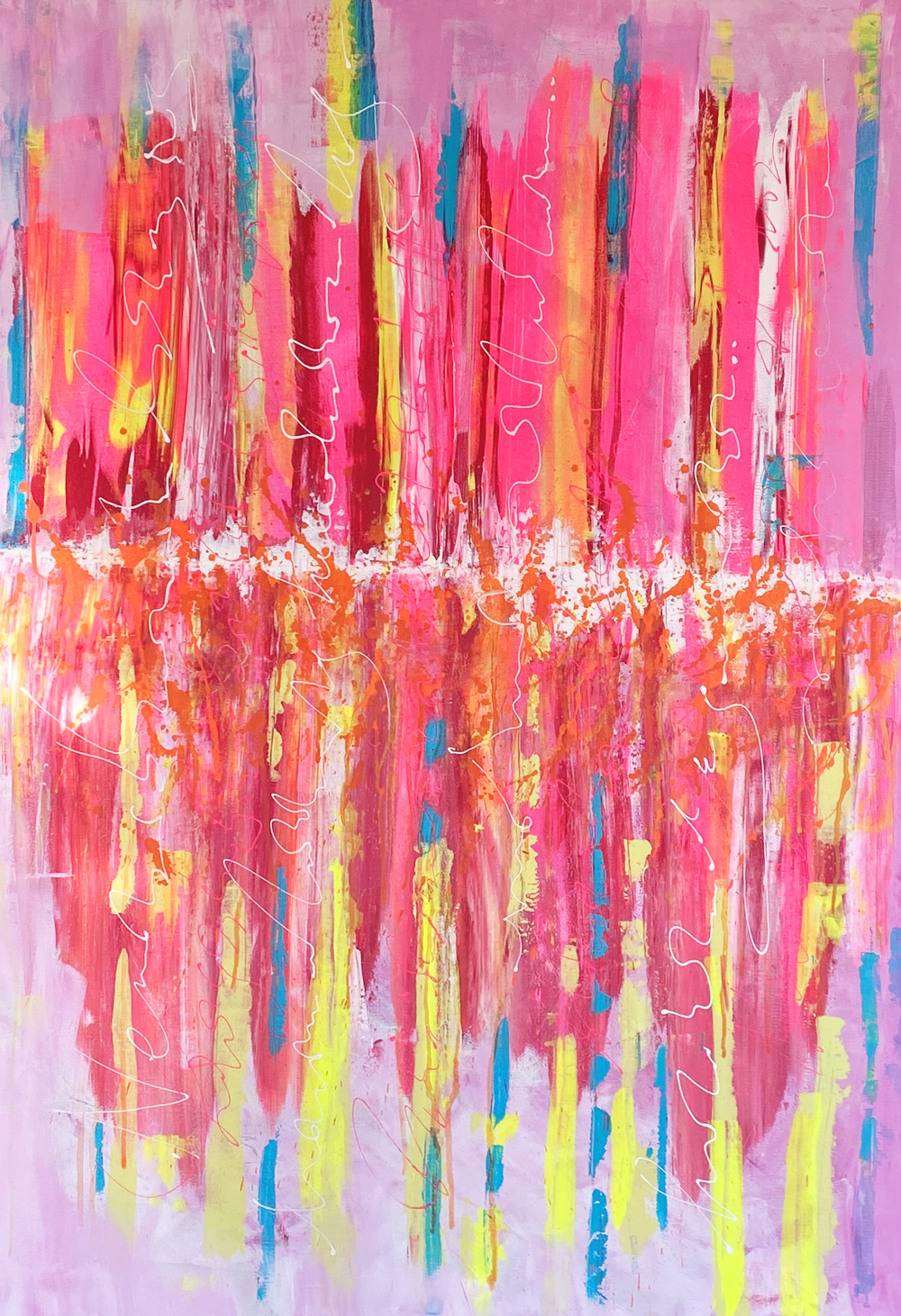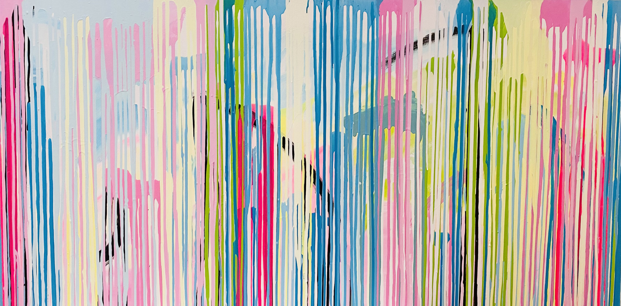 Ein Tanz aus Licht und Farbe – sanfte Pastelltöne fliessen hinab, durchbrochen von leuchtendem Pink und Grün. Wie Reflexionen auf stillem Wasser ziehen feine Linien ihre Spuren.