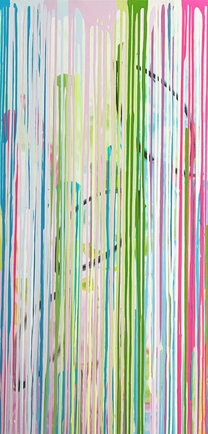 Farben tropfen herab wie zerrinnende Erinnerungen, Linien verschleiern das Verborgene. Hinter dem Schleier aus Blau, Grün und Rosa blitzt eine fragmentierte Wirklichkeit hervor – ein flüchtiger Blick auf das, was war oder sein könnte.