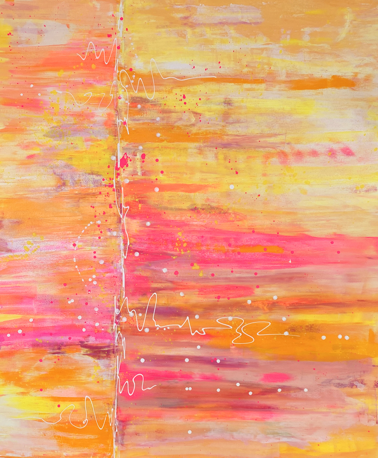Ein leuchtendes Farbenspiel aus Orange, Gelb und Pink durchzieht die Leinwand wie ein glühender Sonnenaufgang. Eine feine, weiße Linie zittert und tanzt durch das Zentrum, wie der Pulsschlag eines lebendigen Moments. Farbspritzer und sanfte Übergänge erzeugen eine vibrierende Energie – eine pulsierende Strahlkraft, die Licht und Bewegung einfängt.
