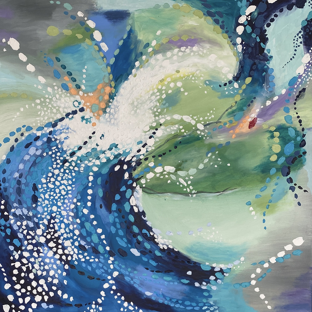 Sanfte Linien fliessen wie ein Hauch von Wind, wie die Spur einer schwebenden Feder auf stiller Wasseroberflächt. Blau, Grün und Violett verschmelzen zu einem Tanz aus Bewegung und Leichtigkeit, als würde eine Feder den Rhythmus der Strömung nachzeichnen.