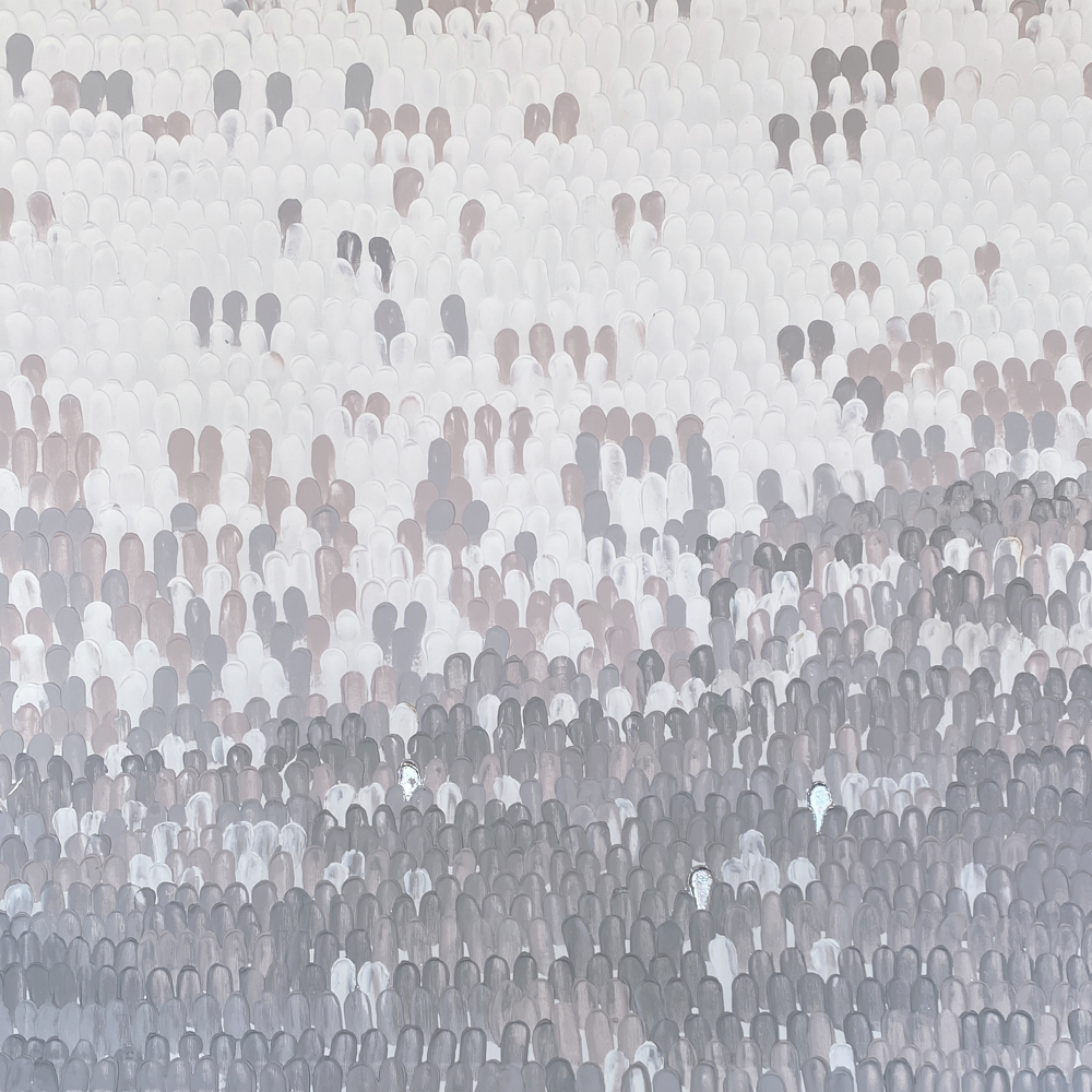 Unzählige abstrakte Pinselstriche formen eine vergängliche Menschenmenge. Sanfte Farbverläufe in Weiß, Beige und Grau erinnern an flüchtige Begegnungen – Gestalten, die kurz auftauchen und wieder verschwinden. Vereinzelte dunklere Akzente heben Momente hervor, die sich im Strom der Zeit auflösen.