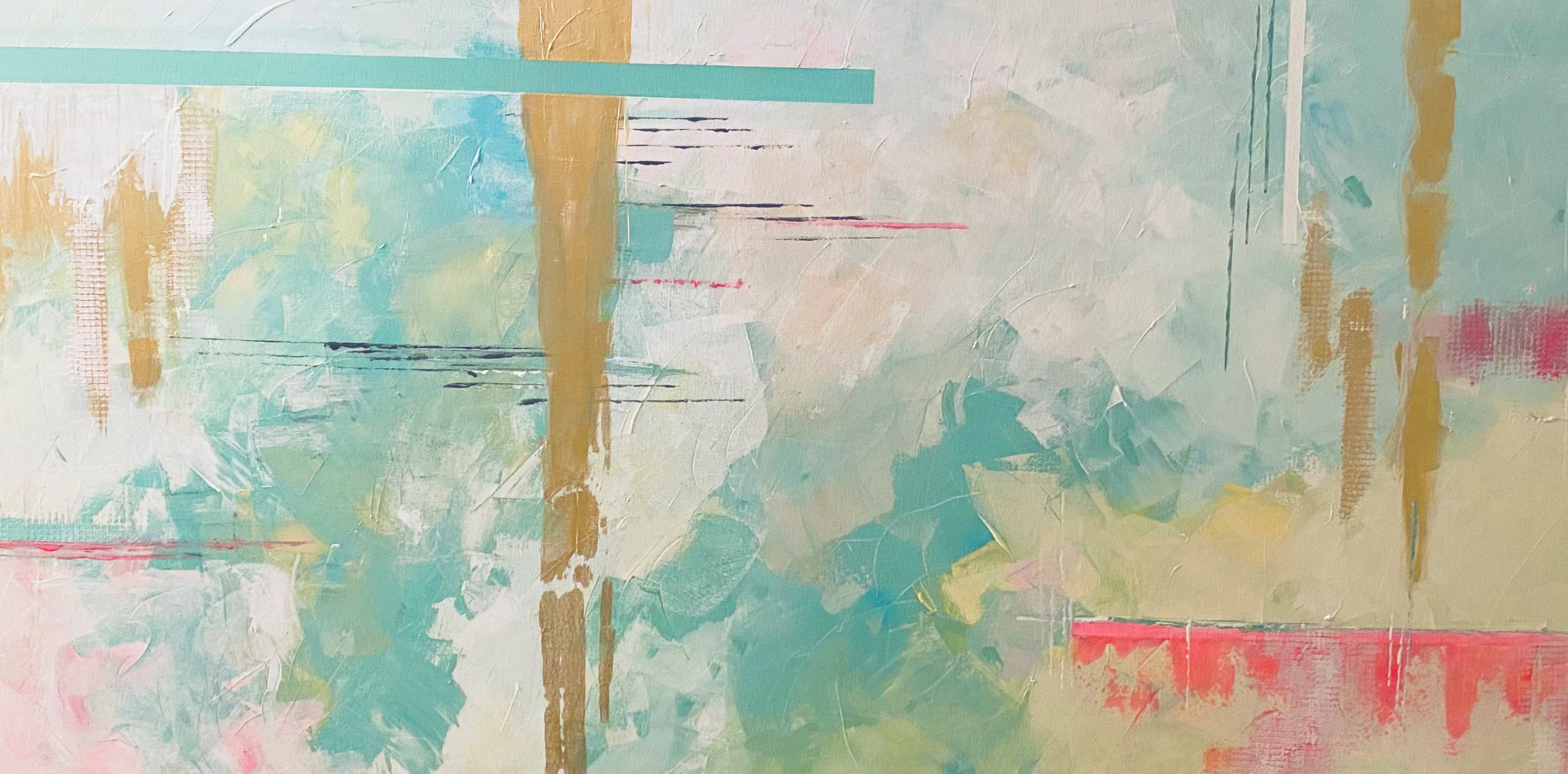 Sanftes Türkis fließt wie Morgennebel über die Leinwand, durchzogen von goldenen Spuren und flüchtigen Rottönen. Linien schneiden durch die Stille, Erinnerungen tauchen auf und verblassen – ein leises Echo der Zeit.