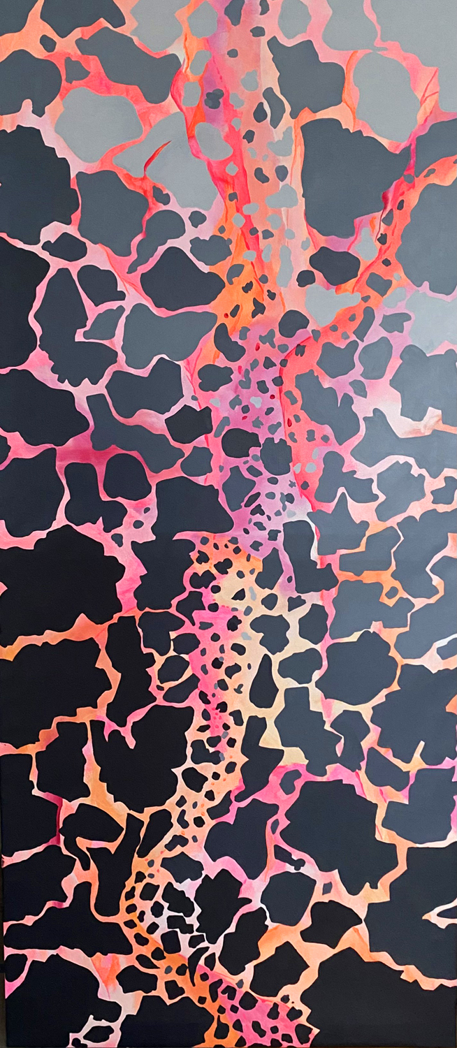 Leuchtende Farben durchbrechen dunkle Flächen wie ein pulsierender Strom. Organische Formen erinnern an fließende Lava, die sich unaufhaltsam ausbreitet. Eine unsichtbare Kraft scheint aus der Tiefe zu dringen und zieht den Blick in ihren Bann.